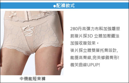 豐胸線條搭配側邊魔翼加高包覆設計,輕鬆展現動人深溝, 美型雙色蕾絲設計,極緻美感令人驚豔。 款式:中機能短束褲 1.採用280丹高彈力布料加強雕塑。 2.標準腰別設計,前腹片採3D 立體加壓織法,針對惱人的小腹,加強收腹效果。 3.後片採立體雙層托臀設計,能提高臀線,完美修飾臀形。 4.褲口採用輕薄超彈性蕾絲,不緊繃、無束縛感,搭配外服可?無痕效果。 5.前中心交叉緞帶設計,增加商品設計感及具有修飾身型的功能。 6.前褲片採用金屬紗線作裝飾有如寶石般閃耀動人,為女性打造多樣風情。